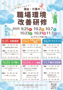 社会福祉施設や介護事業所等の管理者等を対象に、職員が生きがいをもって意欲的に楽しく働き続けることができる環境と、新たな人材の参入を促すための魅力的な職場の構築するための職場環境の改善を主題とする研修会です。