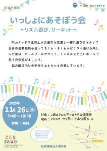 主催者 Picoナーサリ玉川上水公園 電話 03-3333-1808 Eメール tamagawapark@kazenomori.or.jp 所在地 Picoナーサリ玉川上水公園 〒168-0082 東京都杉並区久我山1-6-12 日付 2025年 11月 26日 (水) 期限切れ! 時刻 9:40 AM 【保育所体験】いっしょにあそぼう会 Picoナーサリ玉川上水公園9:40~ – – – – ☆会場のご案内 このイベントをシェアする + Googleカレンダーに追加 + iCal / Outlookのエクスポート 満員