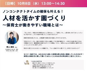 風の森統括 野上美希が、10月8日 (水)、ベビージョブ主催主催のセミナー「BABY JOBアカデミー」(オンライン開催)にて登壇させていただき、『保育士が働きやすい職場』をテーマに 風の森の働き方改革と保育士採用についてお話しました。